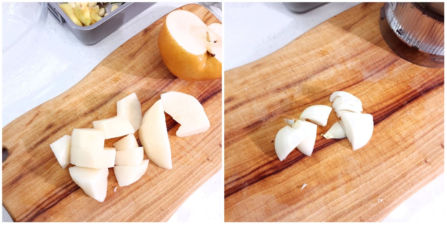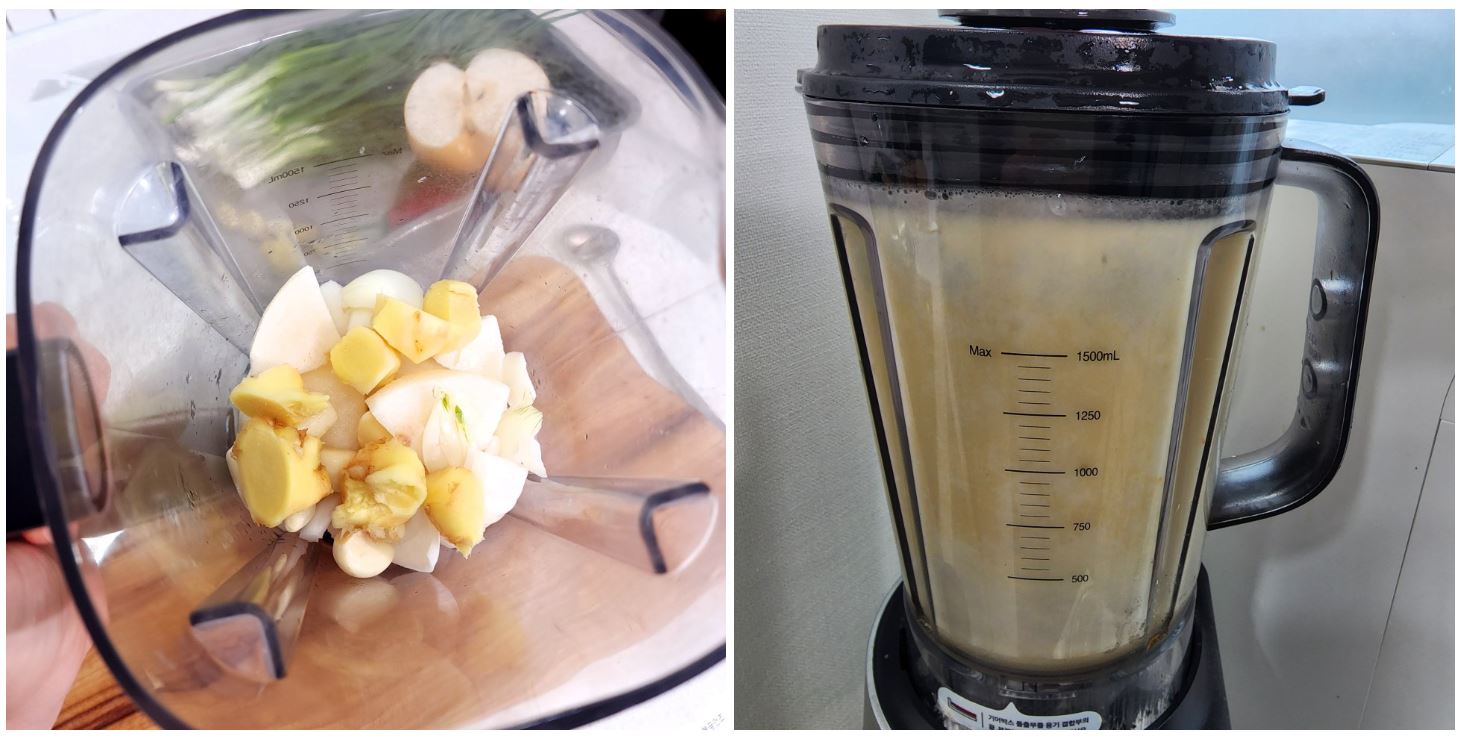 준비된 배, 양파, 생강, 통마늘(통마늘 꼭지는 잘라주세요)이 갈아질 정도의 물을 넣고 곱게 갈아주세요.