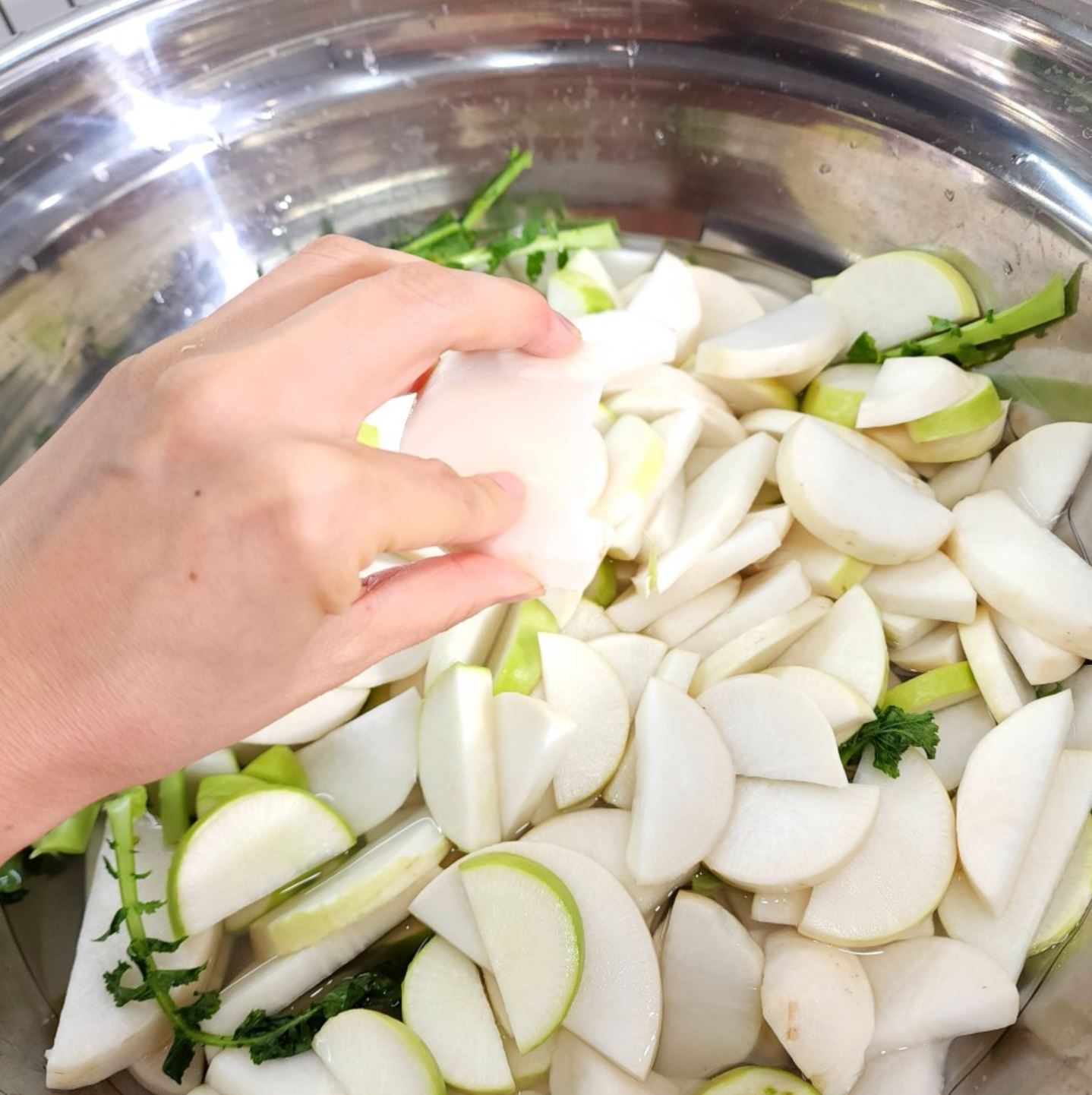무가 절여진 상태는 무를 손으로 휘었을 때 꺾이지 않고 잘 휘어지면 무가 잘 절여진 상태예요. 무의 두께에 따라 절여지는 정도가 다를 수 있어요. 손으로 꼭 무를 휘어보고 잘 휘어진다 싶을 때 무를 꺼내주세요. 무를 절이고 나온 물은 절대로 버리시면 안 됩니다. 이 물이 들어가야 동치미 육수가 맛있어요. 무가 절여지는 동안 동치미 재료와 육수를 준비할게요.