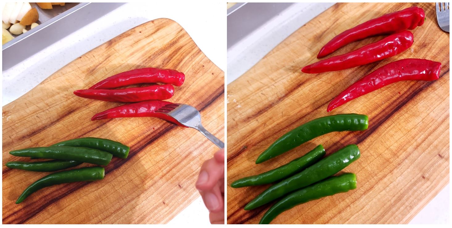 홍고추와 청양고추는 10개 정도 넣는데요, 맛이 잘 우러나올 수 있도록 포크로 콕콕 찍었어요. 고추를 잘라서 넣으면 고추씨가 떠다녀서 국물이 깔끔하지 못하니 이렇게 큼직한 그대로 넣고 드실 때 모양으로 썰어서 놓아보세요.