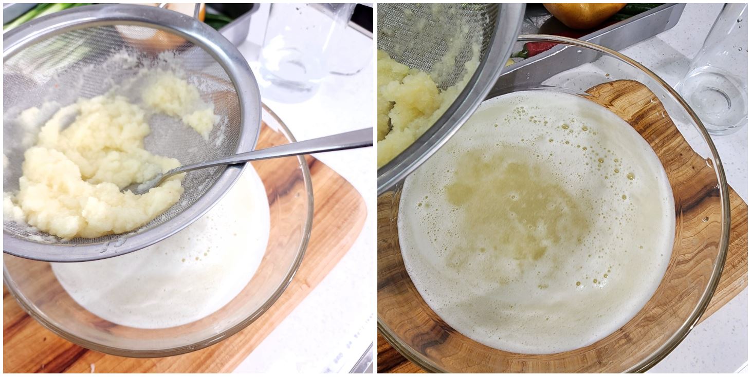 계속 조금씩 물을 넣어가면서 육수를 만들어줬어요. 이렇게 살살 체에 곱게 내려주세요. 마지막 안 내려간 찌꺼기는 버렸지만, 고운 체에 내려 국물도 텁텁하지 않아요.