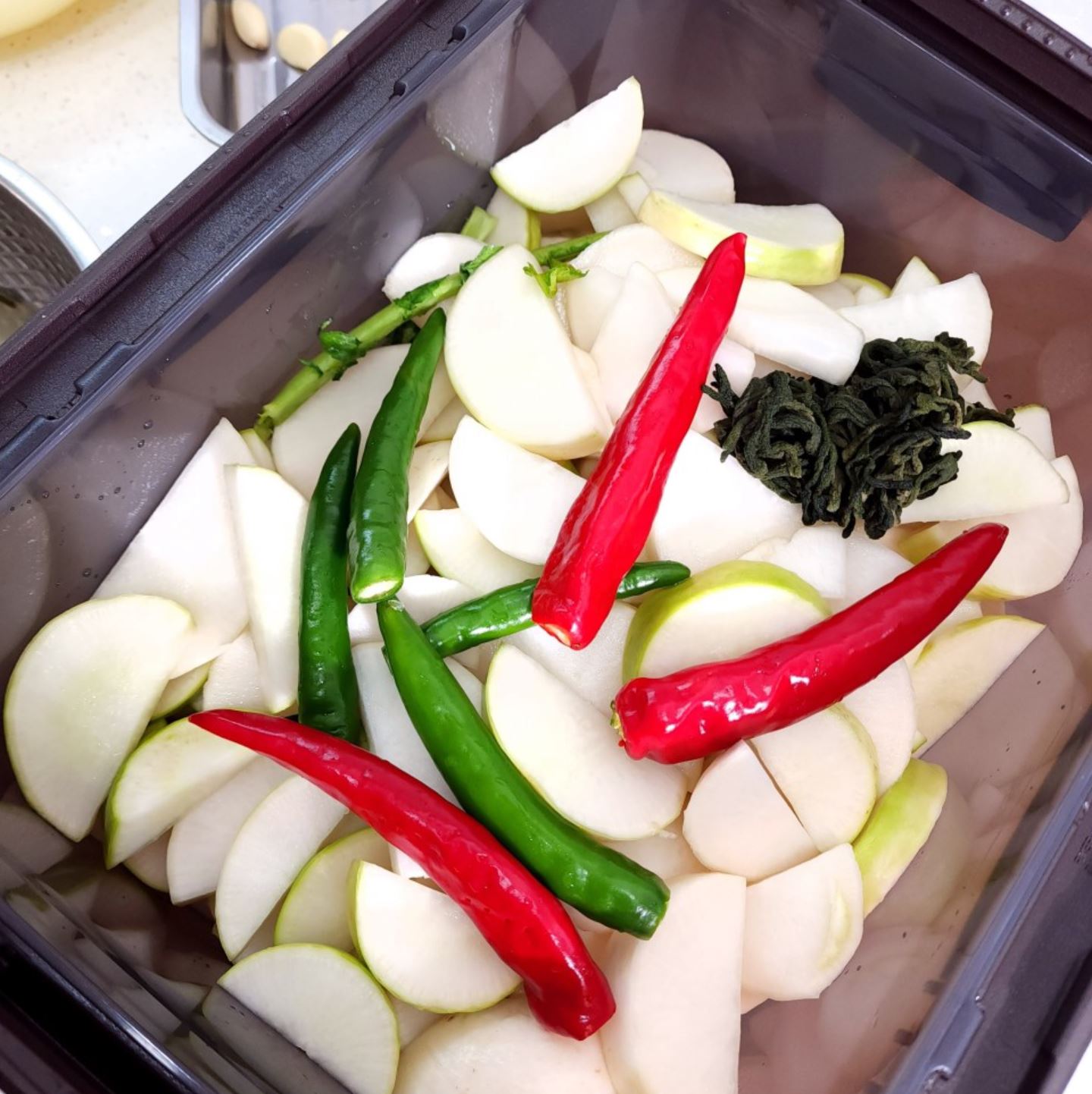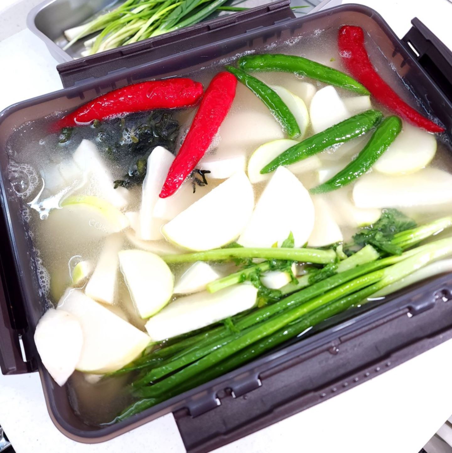 무를 다 넣어주세요. 칼칼하니 맛을 더해줄 홍고추 청양고추 넣고 불려놓은 청각도 넣어주세요. 이제 만들어 놓은 동치미육수를 부어주기만 하면 국물맛 시원한 가을동치미 담그기 완성이에요.