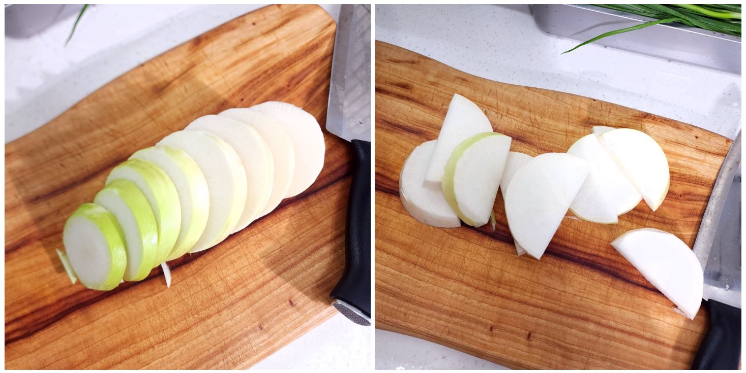 개인적으로 무는 좀 두툼하게 썰어서 반달모양으로 넣는 동치미가 담기도 편하고 맛도 좋아서 큼직한 반달모양으로 썰었어요. 동글동글 그대로 넣거나 한번 더 잘라서 한입 크기의 삼각뿔 모양으로 넣으셔도 됩니다.