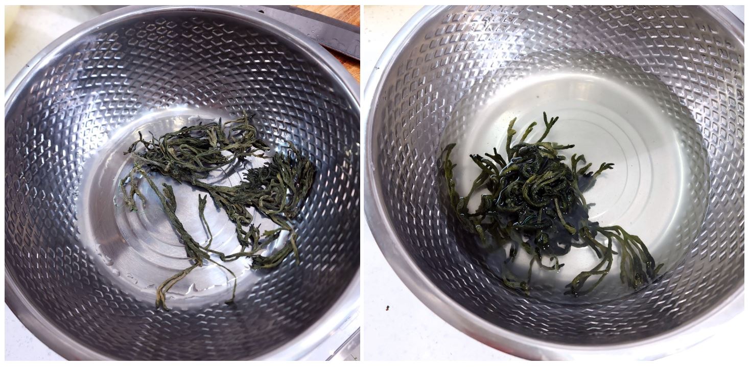 청각을 너무 많이 넣으면 비릿하기 때문에 한두 줄 정도만 불렸어요. 흐르는 물에 깨끗하게 3~4번 깨끗하게 씻어주고 그대로 물에서 10분 정도 불려주면 미역처럼 불어나요.