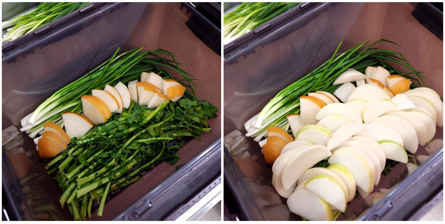 손질한 쪽파 한 줌과 무청을 아래 부분에 깔아주고 배 1/4개는 더 썰어 넣었어요. 이제 무를 차곡차곡 예쁘게 넣어주세요.
