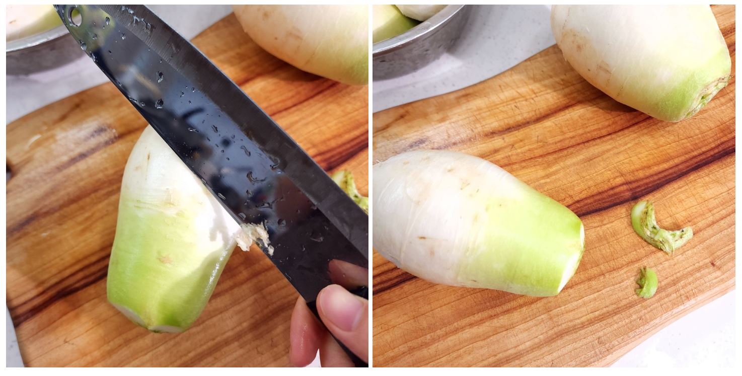 무 손질은 수세미로 깨끗하게 닦은 후에 무 뿌리, 잔뿌리는 제거하고, 수세미로도 닦이지 않은 부분은 칼 뒷면으로 살살 긁어내고, 무 끝부분도 정리해 줬어요.